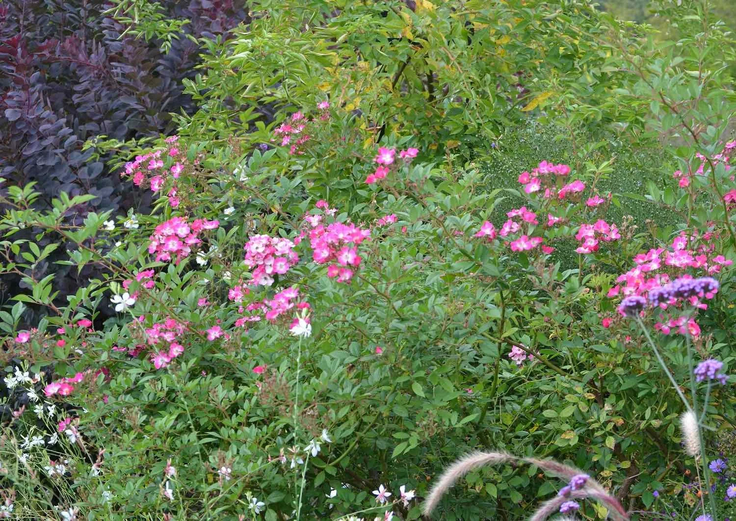 Das dunkelgrüne Laub bildet den nötigen Kontrast und bleibt während der sehr langen Blütezeit gesund und attraktiv. Die Blüten sind gut regenfest.